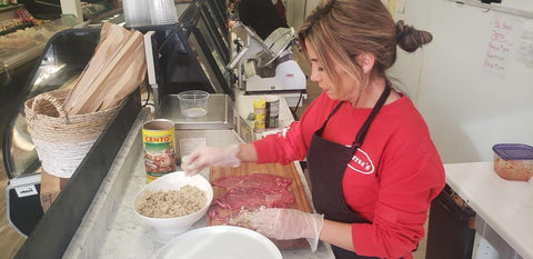 Lay out the single pieces of the steak and rub on both sides with salt, pepper and garlic powder. Mix about a half of a cup of the Romano cheese with about a cup of the bread crumbs and add just a little bit of water to moisten it so that it will stick together. Line one side of the bracciole with the breadcrumbs and cheese mixture in a nice, even layer. Next add the thinly-sliced onion on top. Rip up the bacon into bite-sized pieces and sprinkle over onion. Now begin to roll up each piece of bracciole and tie each end closed with a piece of twine. Then cook the bracciole in homemade tomato sauce in a pot all day, the longer the better.
